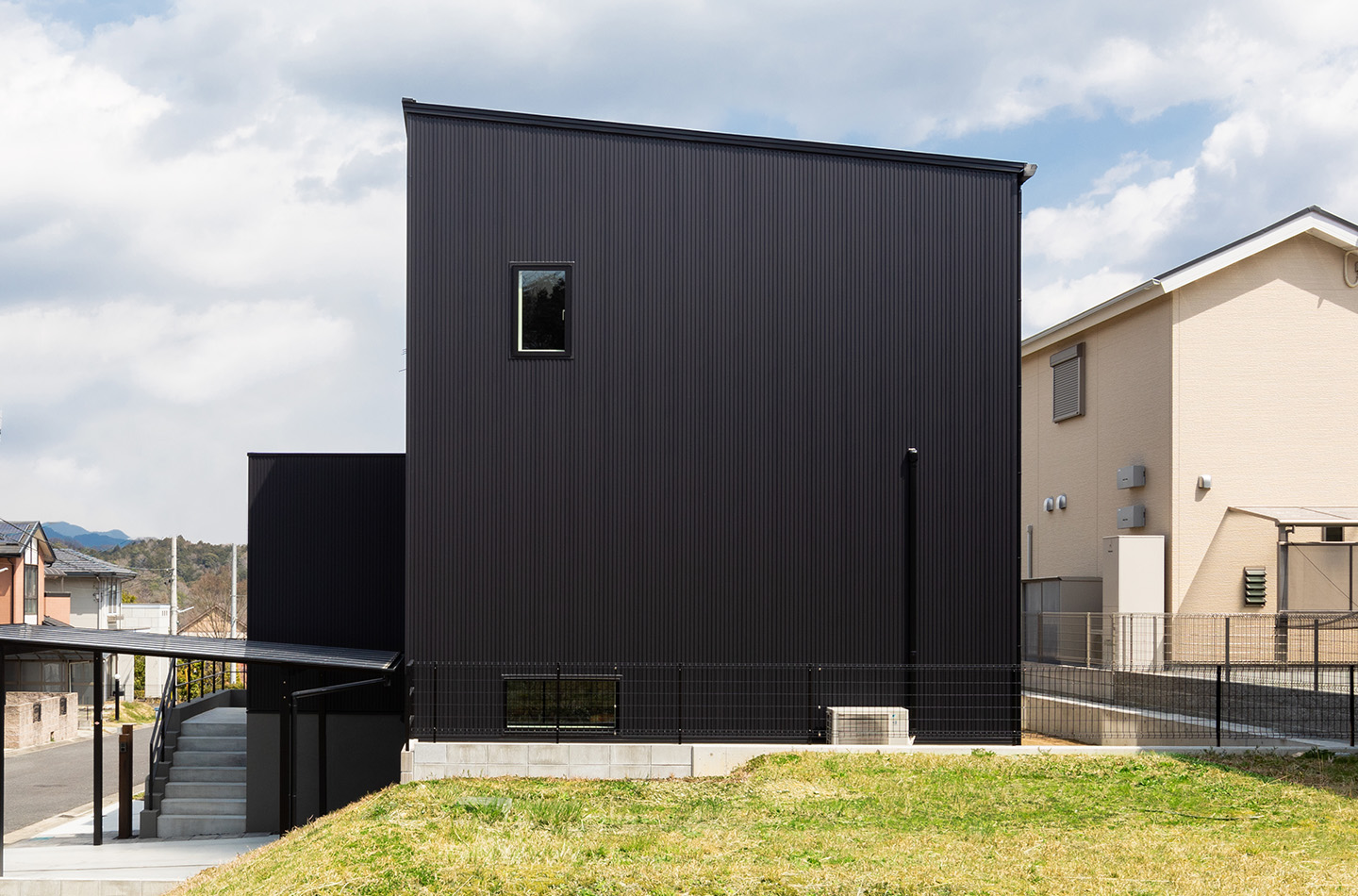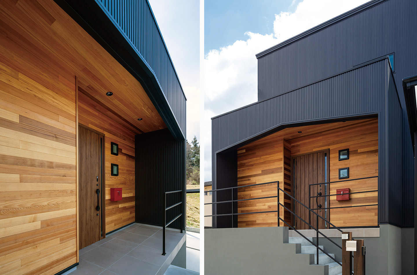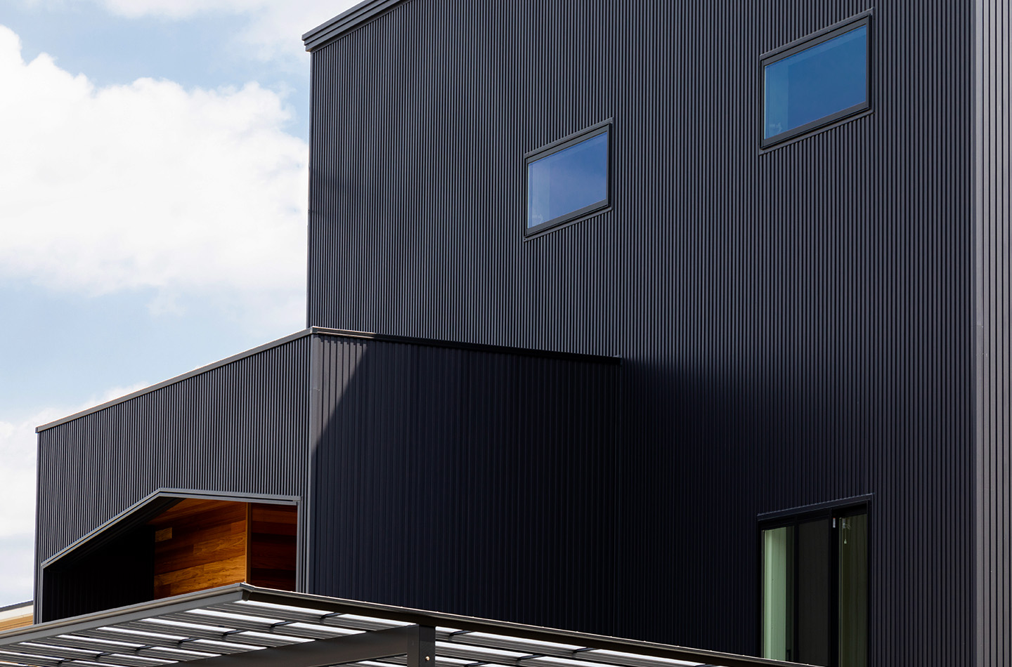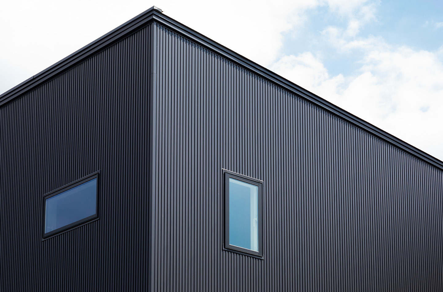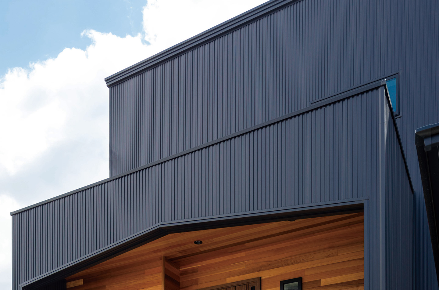 新築 現代風×INDIVITY 印刷する 前のページ シンプルな形の中でファサードに木目柄を配し、アクセントに。 使用している商品 WEBAG2048 スパンサイディングS エストブラックBF 前の事例