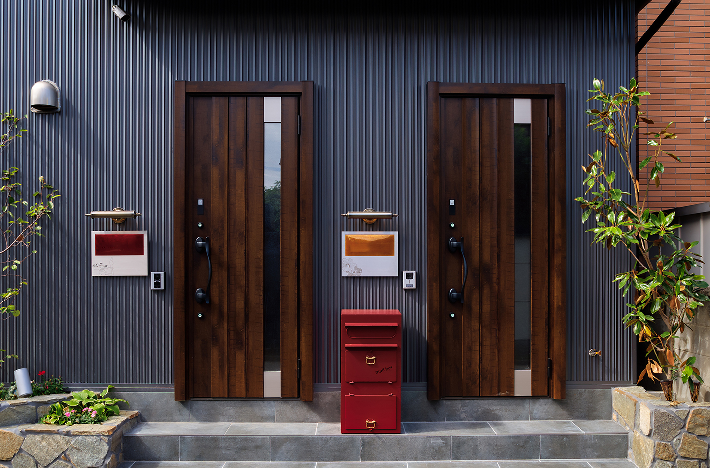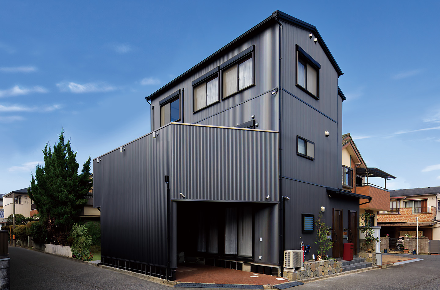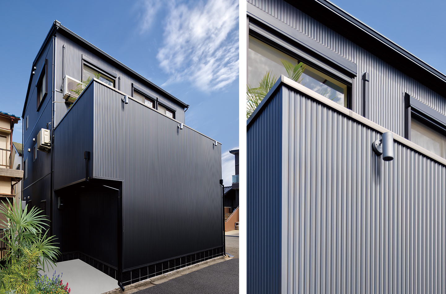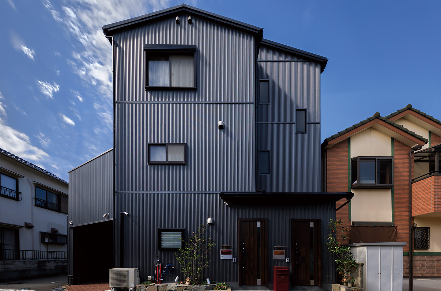 リフォーム 現代風 印刷する 3階建て2世帯住宅にジオストライプ Sを全面に使用し、玄関やサッシ色や 小物でアクセントを加えました。 使用している商品 WEBFG2078 ジオストライプS エストガンメタルBF