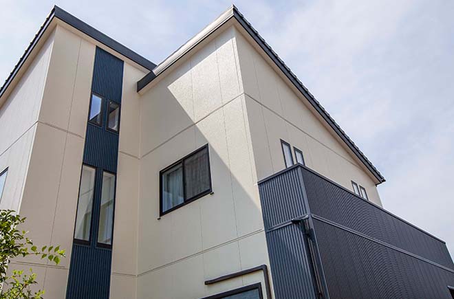 リフォーム 現代風 印刷する 前のページ 建物の形状を活かした白黒の張り分け。よりシャープでスタイリッシュな仕上がりとなっています。 使用している商品 WEBAG2078 スパンサイディングS エストガンメタルBF WNKQ4W ワイド・ニューコタタキ14NC ホワイト 前の事例