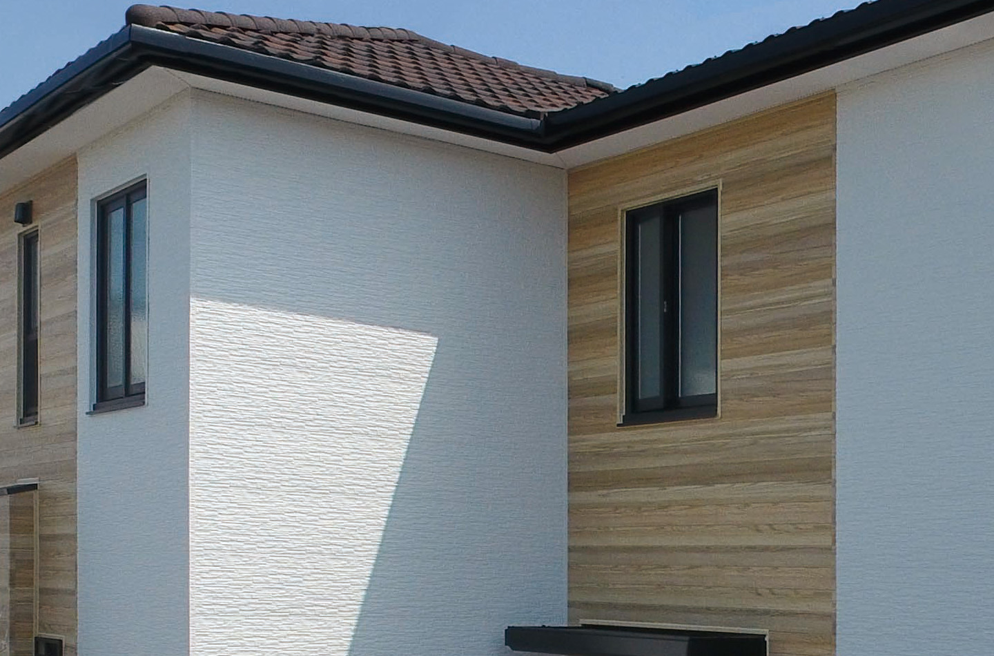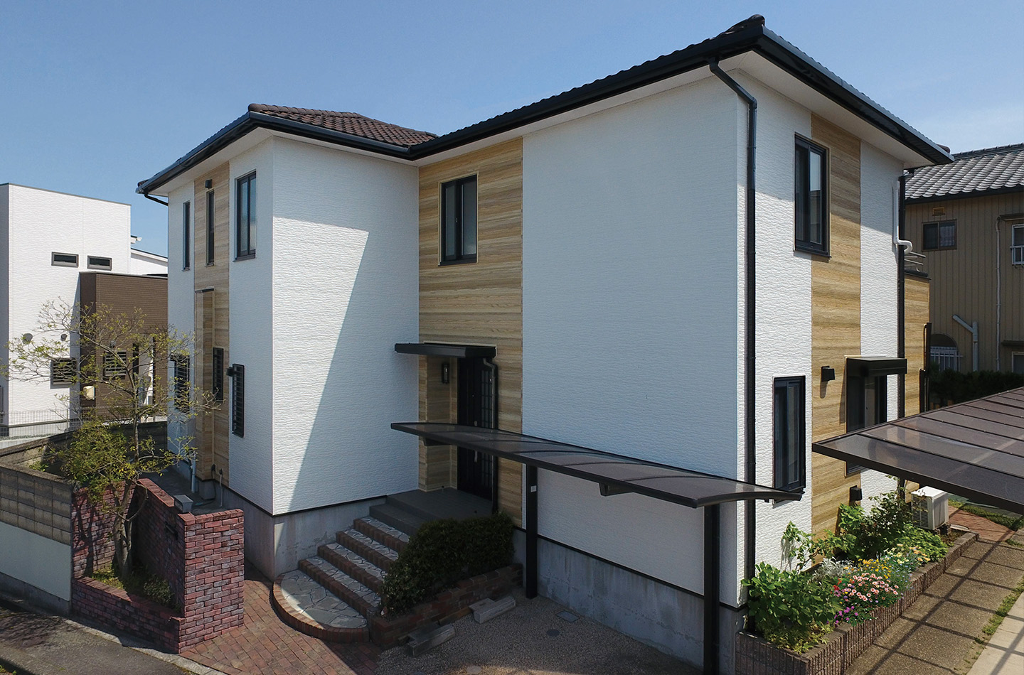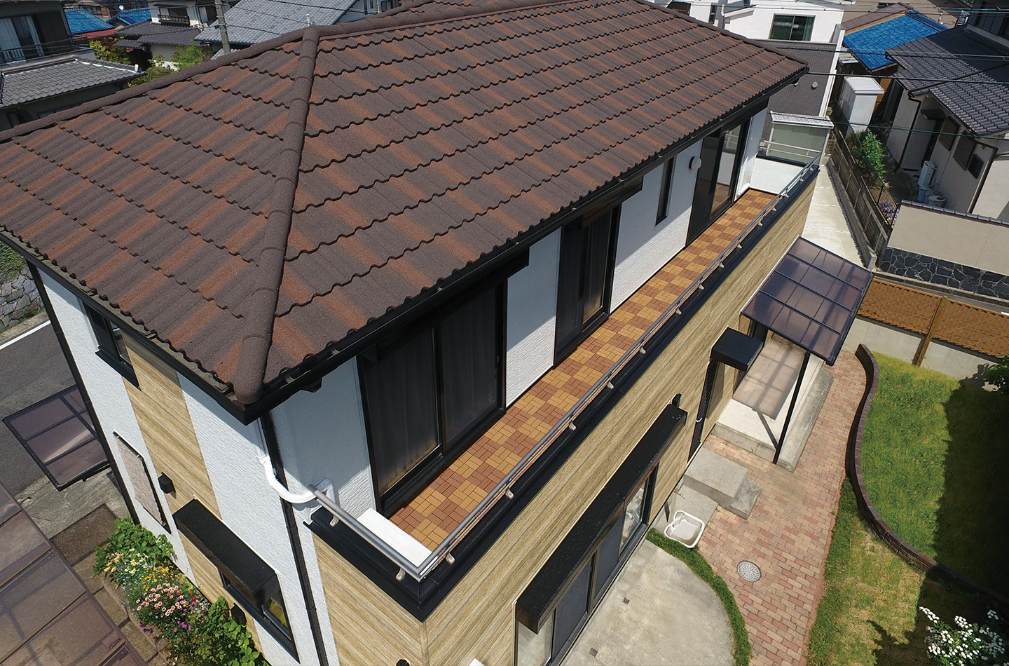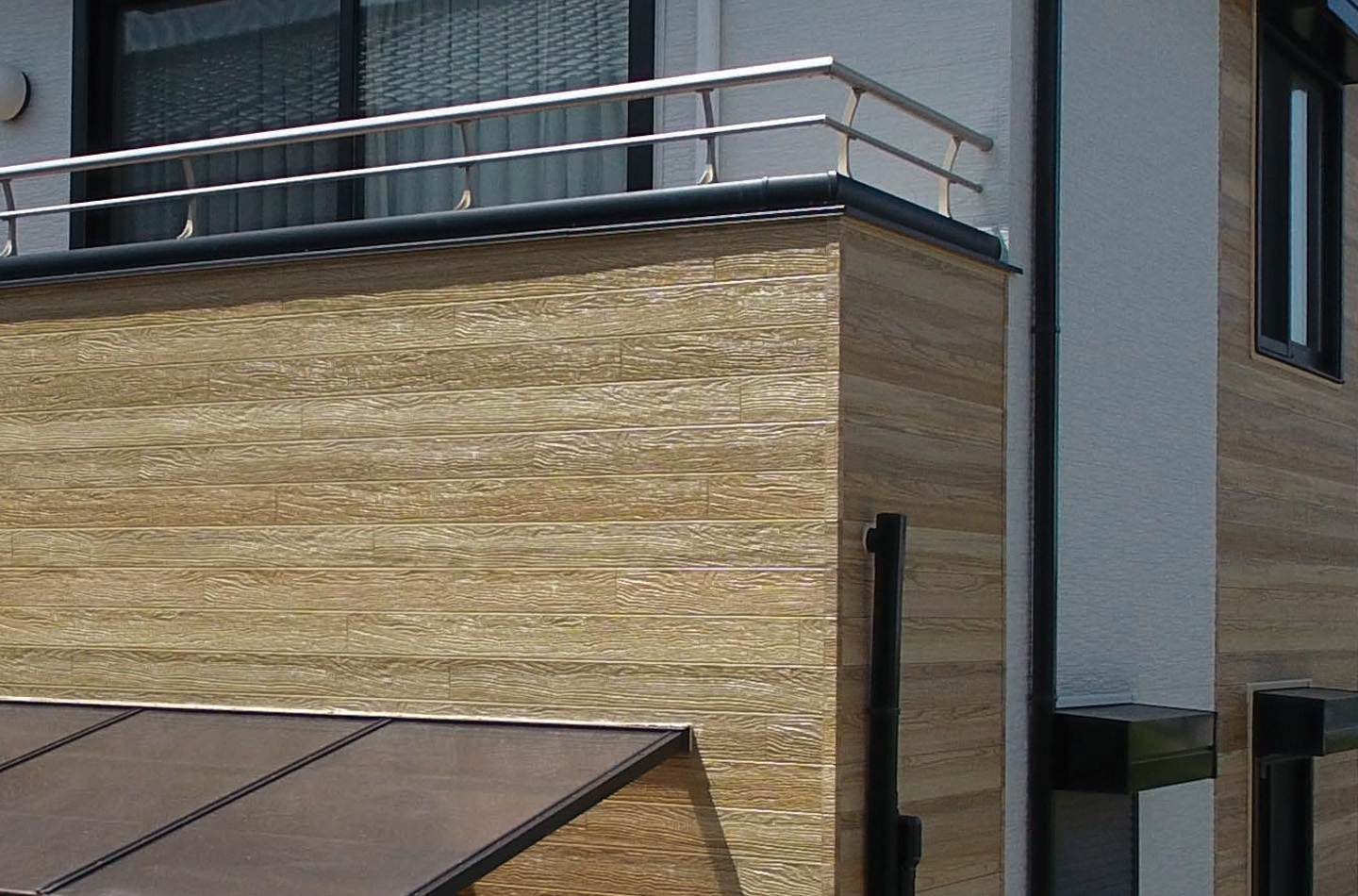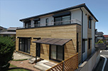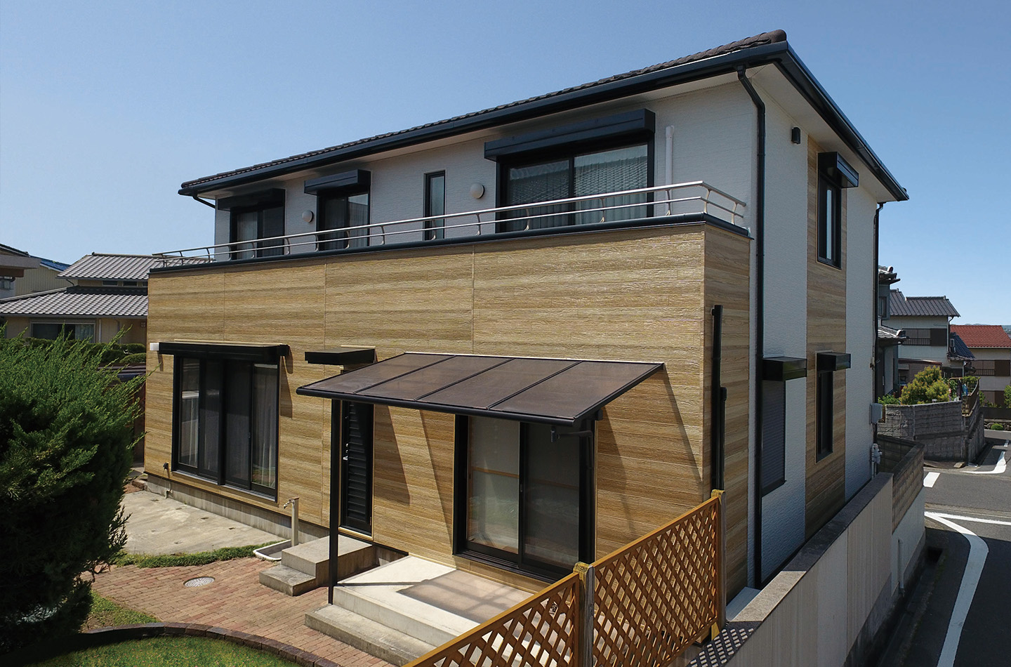 リフォーム前は全面張りでしたが、カタチの特徴を活かし、バルコニーと側面をプレシャスウッドで張り分けたデザインが成功しています。