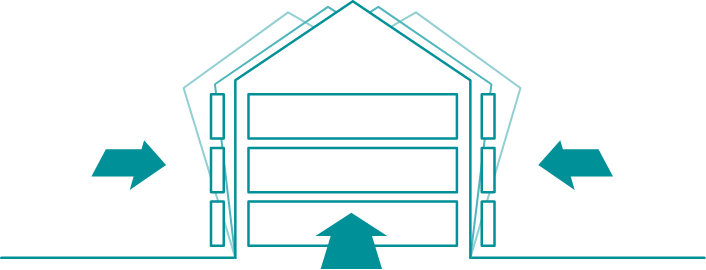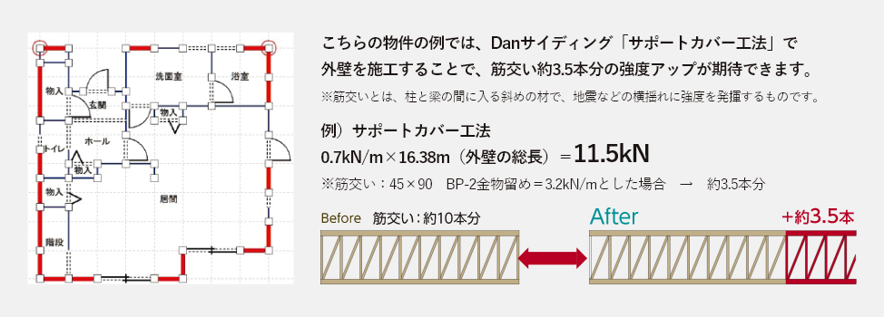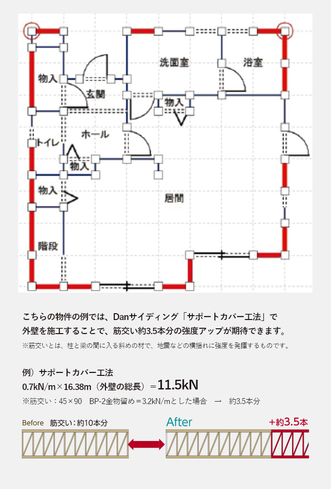 指定のエ法で壁にDanサイディングを重ね張リするので、復旧工事や家具の移動などの必要があリません。壁基準耐力は小さいですが外壁面全体に"重ね張り"することで家全体を強くします。