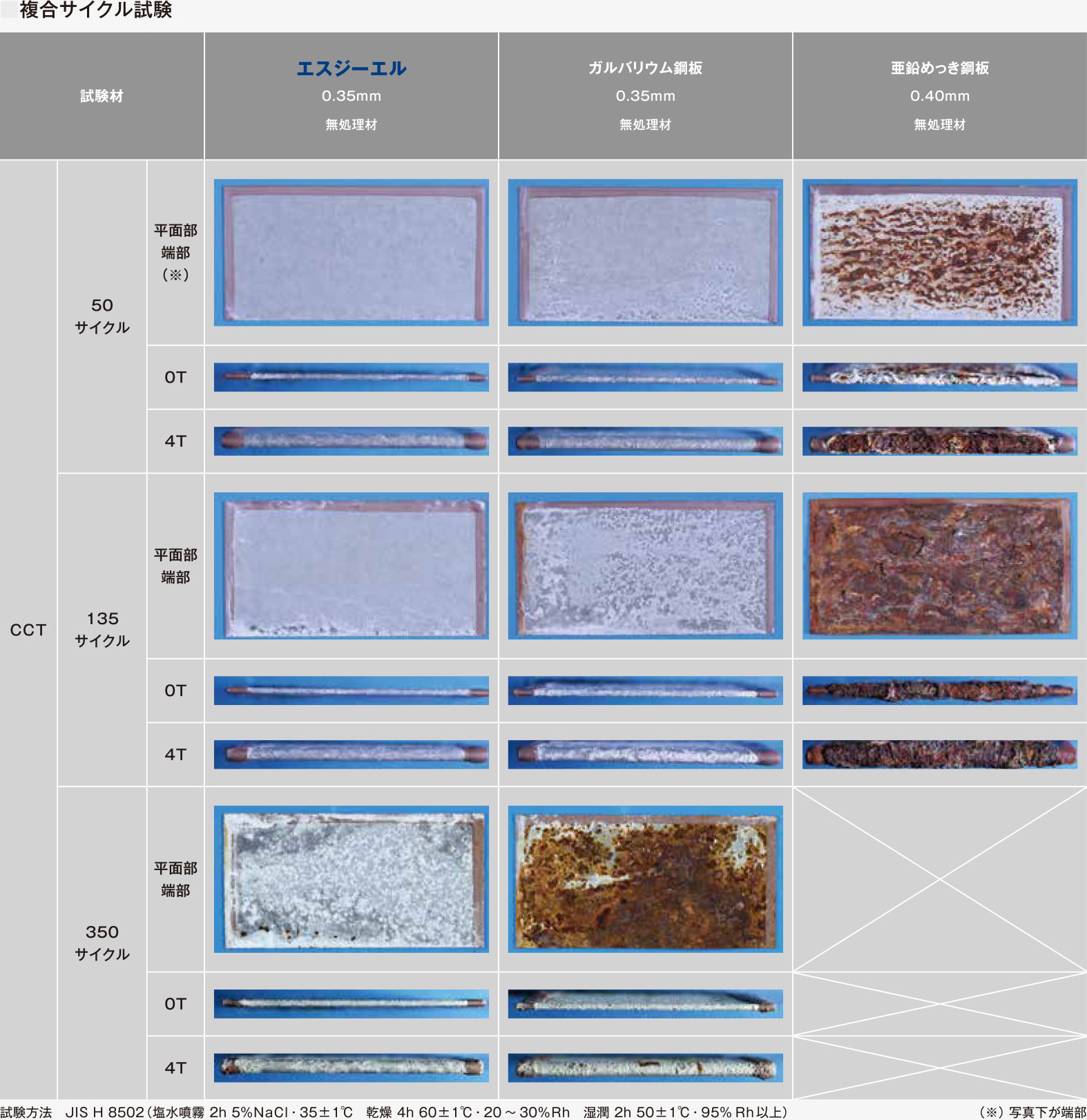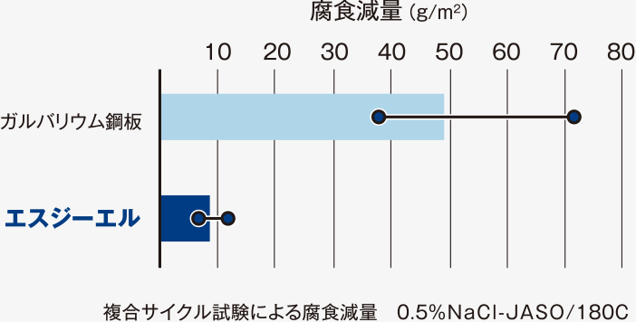 現実環境に近いとされる「複合サイクル試験」で、ガルバリウム鋼板の「平均1/5」の腐食減量を記録したエスジーエル。