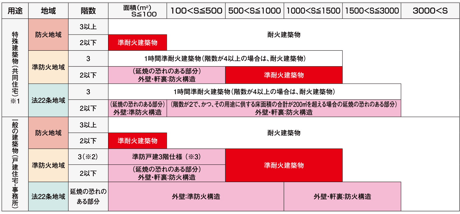 - 百貨店・マーケット・遊技場・飲食店・店舗等:3階以上または延面積3000m2以上は耐火建築物、2階以下で2階の床面積が500m2以上の場合は準耐火建築物