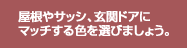 - 屋根やサッシ、玄関ドアにマッチする色を選びましょう。