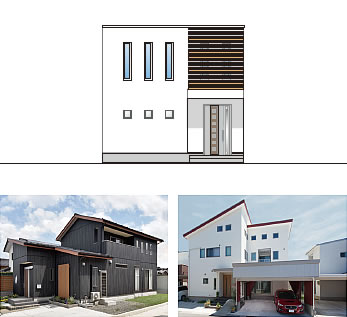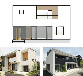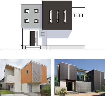 いろいろな張り分けを複合させてデザインする方法です。変化に富んだ個性的な外観になります。縦ラインと横ラインの関係に注目して張り分けます。